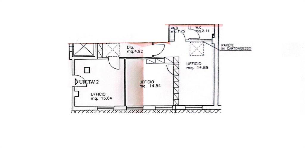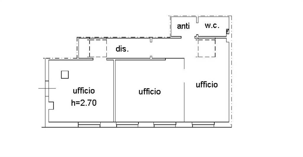 Composto da ingresso da 3 uffici di circa 15 mq cadauno, un bagno con antibagno e disimpegno.